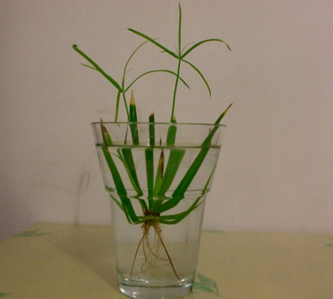 Размножение циперуса черенком, тоже сложности не представляет. Черенок берется с верхней части побега, это его верхушка, длиной 15-20 сантиметров. Срезается она под узелком. При необходимости, листочки верхушечной розетки подрезаются до нужной длины. Черенок помещается в емкость с легкой землей, песком, перлитом или вермикулитом на ваш выбор. Но! Сажается он не традиционно, нижней частью вниз, а наоборот – верхушкой к земле. При этом сам «зонтик» циперуса совершенно необязательно присыпать землей, достаточно зафиксировать его, чтобы он максимально плотно соприкасался с ней. При таком способе размножения следует учитывать, что сам черенок развиваться не будет, он нужен для образования молодой поросли, поэтому даже если он в процессе укоренения усох, то это нормально, и ничего страшного в этом нет. Не менее успешно черенок циперуса дает поросль и в воде (именно так он и размножается в природе). Для этого его черенок ставится в воду тоже «вниз головой». Иногда делают еще естественней. Побег просто наклоняют и опускают верхушку в емкость с водой. Эффект тот же. Молодая поросль и корешки обычно появляются через месяц (бывает и раньше).